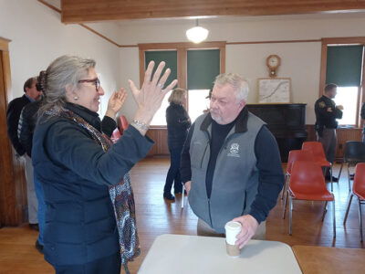 HELEN TAYLOR, left, state director of The Nature Conservancy, and state Rep. Greg Markkanen talk after the public announcement Thursday of the global conservancy organization’s purchase of the Keweenaw Heartlands in Eagle River. (Graham Jaehnig/Daily Mining Gazette photo)