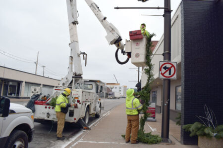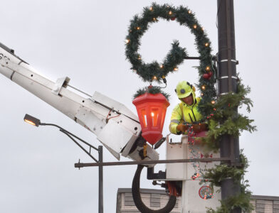 Derek Warren, an Iron Mountain Public Works employee, winds lights around the greenery he put up on a light pole near the First National Bank & Trust office in downtown Iron Mountain on Monday. Working with Warren to get the seasonal decorations in place and lit for the Thanksgiving week were Brad Strehlow and Dallas Degenaer.