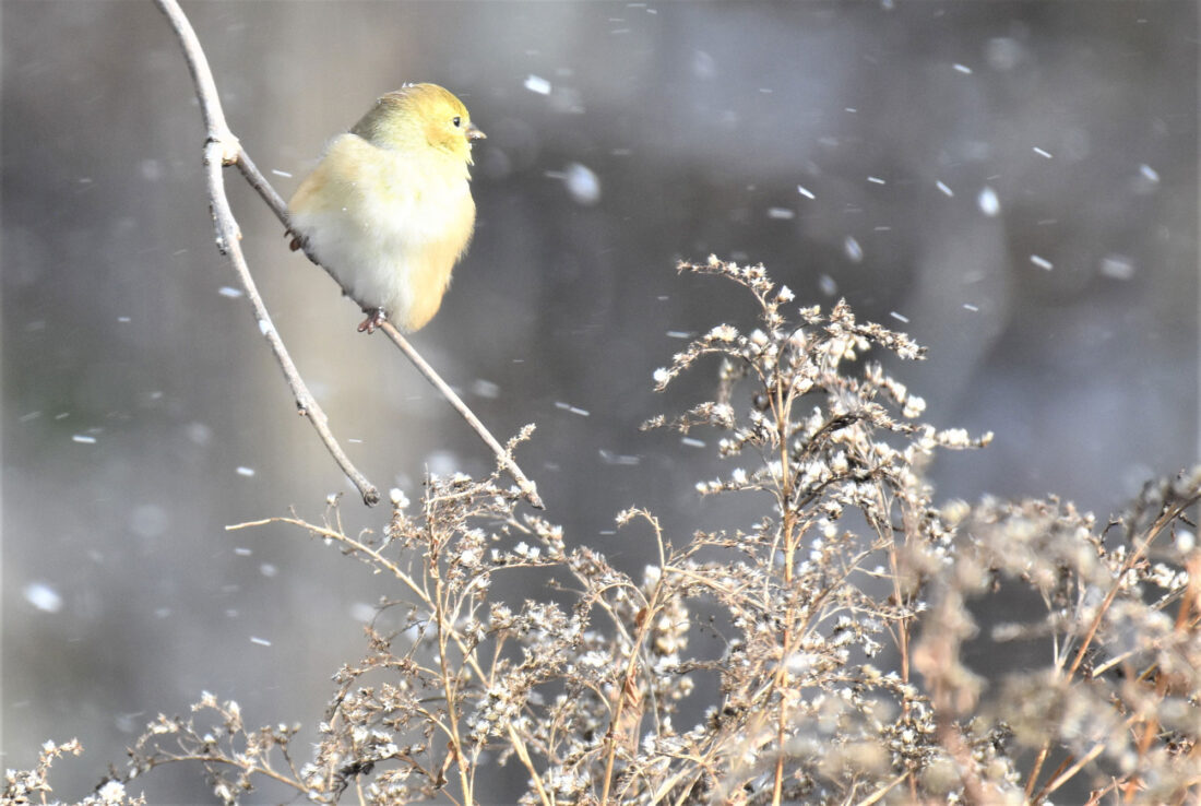 An American goldfinch, in its more drab winter plumage, forages among the grass for seeds amid the swirling snow earlier this week. For more on the finches and other birds of winter in the Upper Peninsula, see this week’s Northwoods Notebook. (Betsy Bloom/Daily News photo)