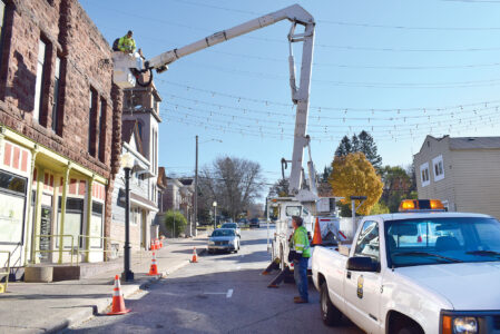 The Iron Mountain Downtown Development Authority won a $500 Neighborhood Bridge Builders grant from the Michigan Municipal League Foundation for its Public Art Sky Installation project. This fall, bistro lights have been installed on Ludington Street as well as the alleyway between the First National Bank & Trust and the Sandstone Studios building. Shown are Iron Mountain Public Works employee Derek Warren stringing the bistro lights in the 200 block of Ludington Street in Iron Mountain, assisted by co-worker Brad Strehlow, and then the finished lights.