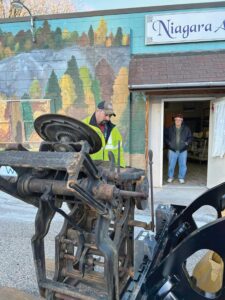 Karen Klenke photo CITY OF NIAGARA crew member Jim Stachowicz helps with the relocation of the antique Chandler & Price Letterpress to the Niagara Area Historical Museum as Historical Society Member Bruce Redmond awaits.