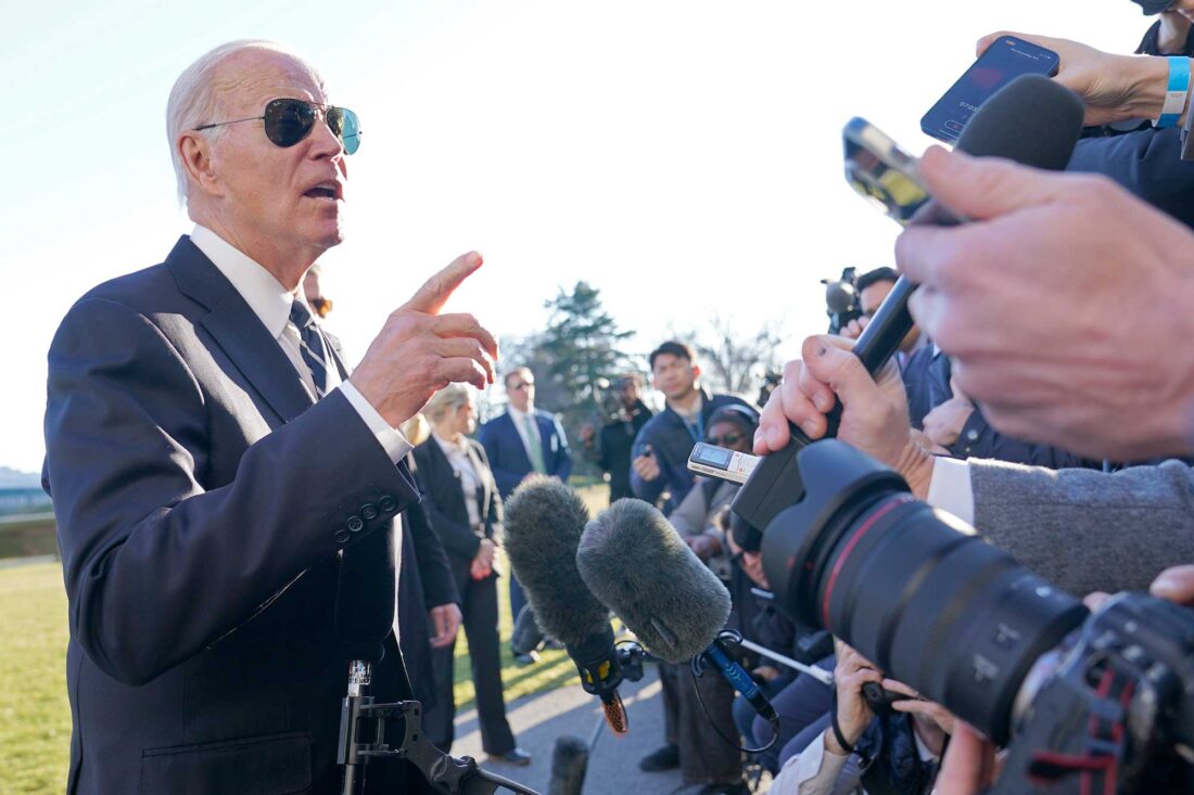 PRESIDENT JOE BIDEN talks with reporters Monday on the South Lawn of the White House in Washington after returning from an event in Baltimore on infrastructure. (AP Photo/Susan Walsh)