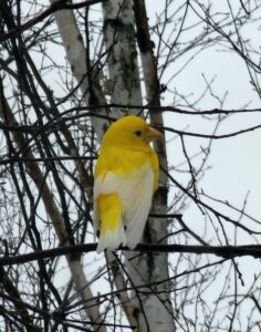The unique all-yellow evening grosbeak continues to pop up in the region.