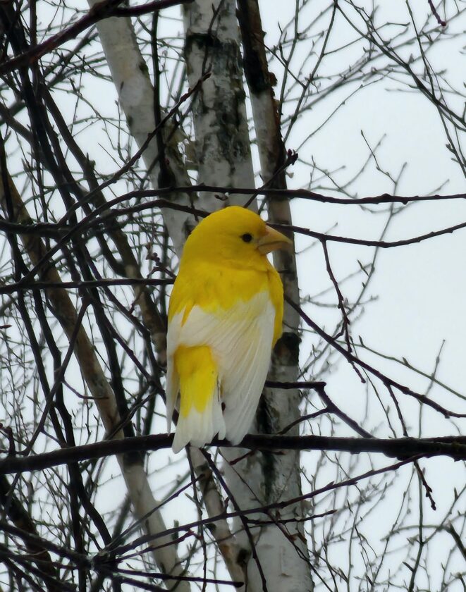 This bird seems to lack all of the black pigmentation that against a yellow background makes the male evening grosbeak so distinctively marked. The only variation to its bright yellow is white wings and tail tip.