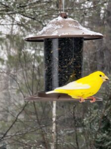 (Pam Opolsky photo) This unusual, all-yellow evening grosbeak continues to be seen in the Dickinson County area, turning up in Randville; Aurora, Wis.; Felch Township early this week; and then Channing on Thursday.