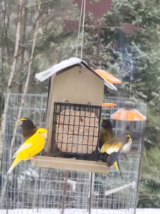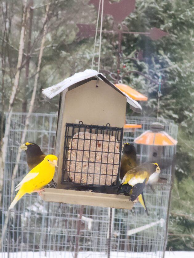 — Evening grosbeaks were seen after being scarce for several years — not surprising, as they arrived in abundance in November.