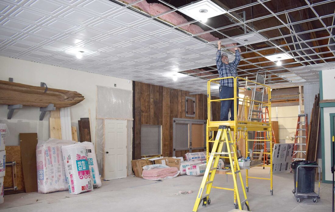 MENOMINEE RANGE HISTORICAL FOUNDATION Treasurer Guy Forstrom installs ceiling tiles in the large area of the new Menominee Range Historical Museum at the Chapin Mine “C” Ludington Shaft Dry building at 300 Kent St. in Iron Mountain. (Terri Castelaz/Daily News photo)