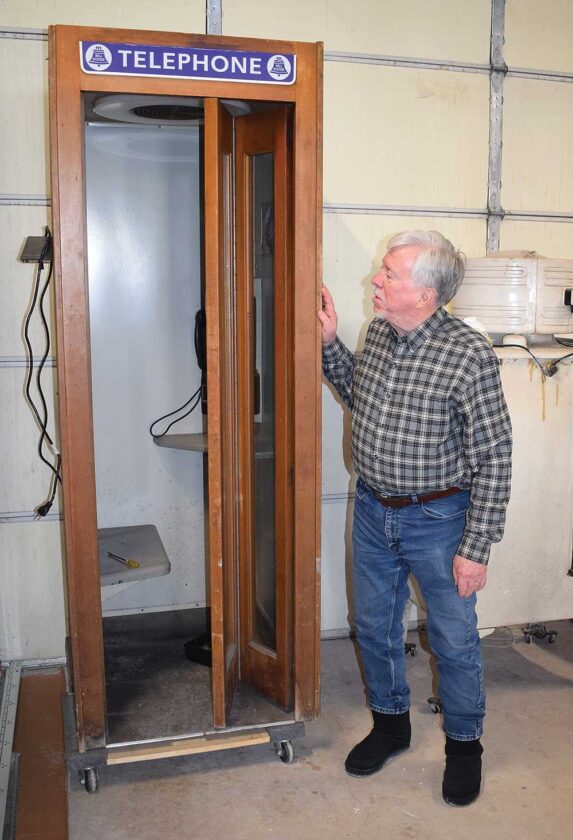 MENOMINEE RANGE HISTORICAL FOUNDATION President and Historian Bill Cummings displays a recently acquired 1950s telephone booth. This will be kept on wheels to move in different locations in the main area of the new museum. (Terri Castelaz/Daily News photo)