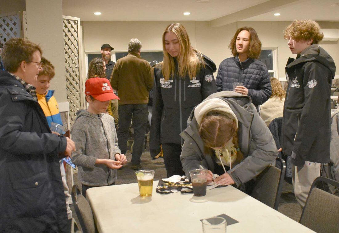 SAMSON HUTCHINSON of Florence, Wis., in the red cap, gets a signature Thursday from ski jumper Adeline Swanson of St. Paul, Minn. Looking on are, from left, Susie Fox of the Kiwanis Ski Club, Brigham Page from Vermont, Anna Zigman of Minneapolis, Nathan Krotz of Minneapolis and Isak Nicholas of Barrington, Ill. The four on the right are not competing in the Continental Cup events but will be fore-jumpers, gaining valuable experience at one of the more challenging hills, Fox said, adding that Zigman and Swanson will be the first women to jump off the new Pine Mountain tower. Thursday’s Meet the Skiers event drew about 150 people and representatives from all eight teams. (Betsy Bloom/Daily News photo)