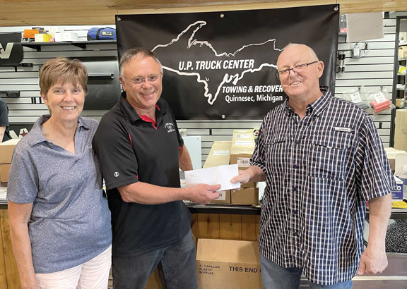 Beth and Tom Sullivan, owners of U.P. Truck Center Towing & Recovery in Quinnesec present a $10,000 check to Mike Tripp, Kingsford Centennial Committee member. The Sullivans said they are proud to be a part of the community and have been servicing the trucking industry for 37 years, recently adding towing and recovery. The Kingsford Centennial will take place Aug. 3-5 at Lodal Park. For tickets and information go to kingsford100thcelebration.com or stop by Kingsford City Hall. Tickets can also be purchased in person at First National Bank of Iron Mountain-Kingsford, First Bank Kingsford, and Bob & Jerry’s in Kingsford.