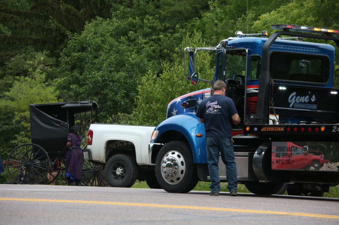 A Gene’s Towing & Recovery employee prepares to hook up to a car that was involved in a crash Wednesday afternoon with a buggy driven by an Amish family, as a woman who was riding in the buggy checks the carriage. In addition to the woman, two young girls were inside the buggy at the time of the crash. The crash took place on M-35 in Gladstone, on the hill just southeast of the John & Melissa Besse Sports Park. Minor injuries were reported.