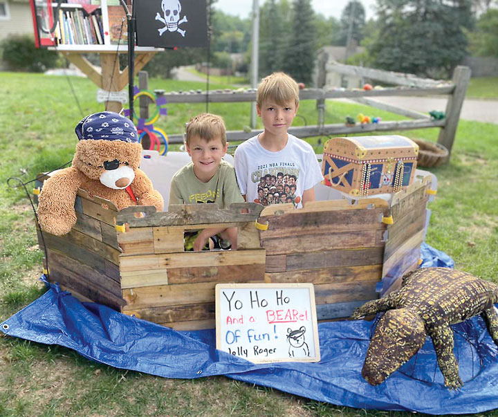 - HARRISON AND BENJAMIN YONKE of Kingsford enjoy the pirate ship with Bear. (Sally Karttunen photo)