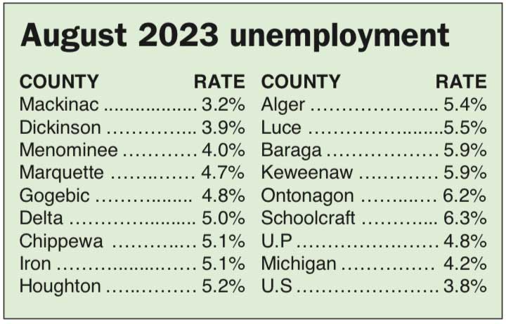 Mackinac County had the lowest jobless rate in the U.P. in August at 3.2%, followed by Dickinson’s rate of 3.9% and Menominee County’s 4%. The highest U.P. jobless rate was 6.3% in Schoolcraft County, while the rate in Ontonagon County was 6.2%.