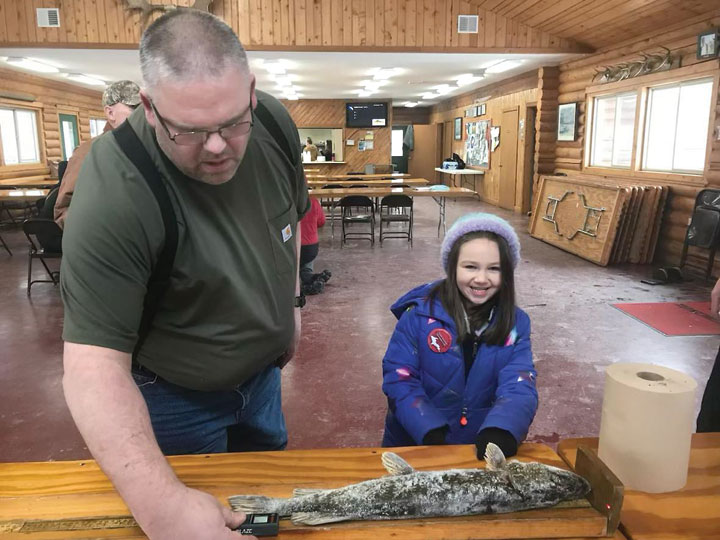 The 50th annual Tip-Up Town of the U.P. is set for Saturday. The fishing contest, sponsored by the Sagola Township Sportsmen’s Club, runs from 7 a.m. to 4:30 a.m. at Edey Lake or Sawyer Lake north of Channing. Club president Tony Erickson measures Mia Fedrizzi’s northern pike at a previous tournament.