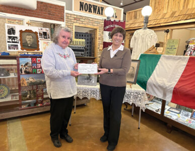 TYROLEAN TRENTINO CLUB Vice President Mary Zanoni presents a check for about $1,200 to Jake Menghini Museum Partners member Rosemary VanPeymbrook. Funds will go to support the new Italian display at the museum. (Terri Castelaz/Daily News photo)