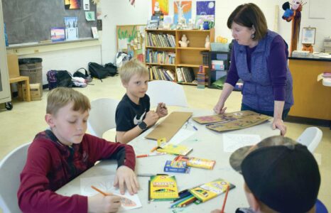 RETIRED ART TEACHER Mary Jo DeSmit assists student Kolton Shuck, left, with an art project while David Blake colors during the afterschool art club at the Crystal Falls Contemporary Center, a place that aims to provide “a safe environment for local and visiting youth and adults to come together for fun, cultural, artistic activities and enrichment.” (Marguerite Lanthier/Daily News photo)