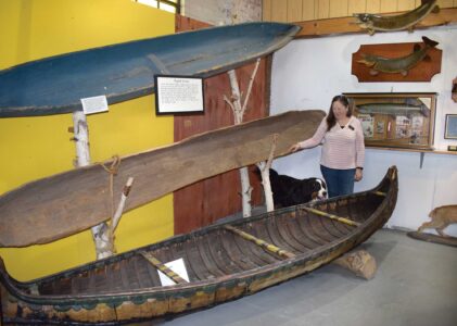 THE IRON COUNTY Historical Museum in Caspian opens today for the summer season. Visitors are welcome from 9 a.m. to 3 p.m. Monday through Friday and 10 a.m. to 2 p.m. Saturdays from June through August. Museum Director Kathlene “KL” Long and Zoey show of the dugout canoe displays in Heritage Hall. (Terri Castelaz/Daily News photo)