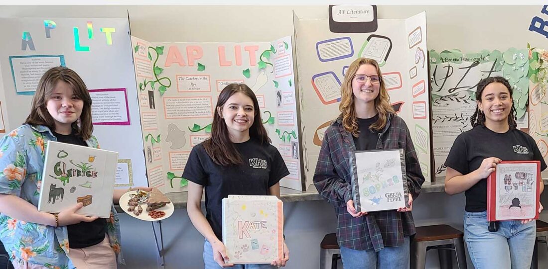 One of the Kingsford High School AP Literature class’s culminating projects is an artistic summary of the main concepts covered throughout the year. Students designed a tri-fold presentation board and put together a portfolio of assignments. The students did amazing work. They were on display in the KHS media center. Congratulations to all the seniors; their hard work and dedication will be missed. From left with their displays, Clairice Strehlow, Kate Wenzel, Sophia Anderson, Branna Hammond.