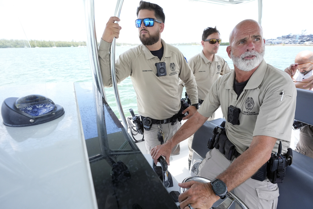 Officers with the Miami-Dade County Police Department's Marine Patrol, Adam Fullana, left, Sean Carper, center, and Thomas Kennedy, right, are shown, Wednesday, July 3, 2024, near Key Biscayne, Fla. Elected officials and law enforcement agencies urged boaters not to drink and drive, check the weather before going out and to consider taking a boater safety course during a news conference ahead of the holiday weekend. (AP Photo/Wilfredo Lee)