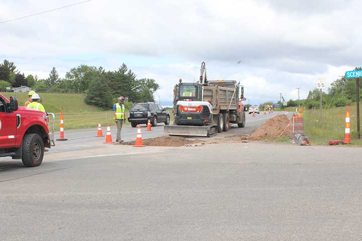 A crew from the Dickinson County Road Commission works to repair a leak from the Norway Spring on U.S. 2 on Wednesday. Last year crews putting in fiber cable pierced the spring, causing water to run onto the highway. The repair was completed by early afternoon. (Jim Paul/Daily News photo)