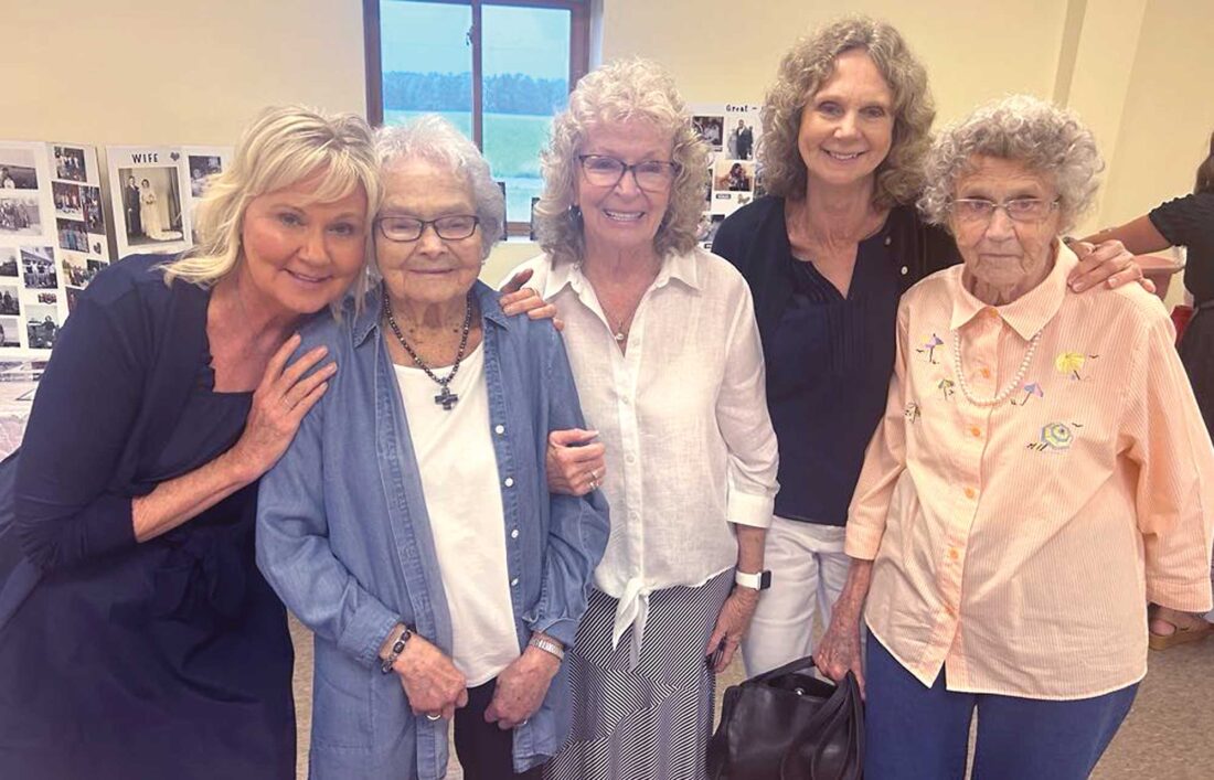 FAMILY AND FRIENDS gathered last weekend to celebrate Evelyn “Evie” Patterson’s 100th birthday. From left are Peggy Knutson, Marjorie Knutson’s daughter; Evie Patterson; Cheri Hamilton, Patterson’s daughter; Charlotte Grenier, Marjorie Knutson’s daughter; and Marjorie Knutson, who with longtime friend Patterson worked as a welder during World War II. (Karen Klenke photo)