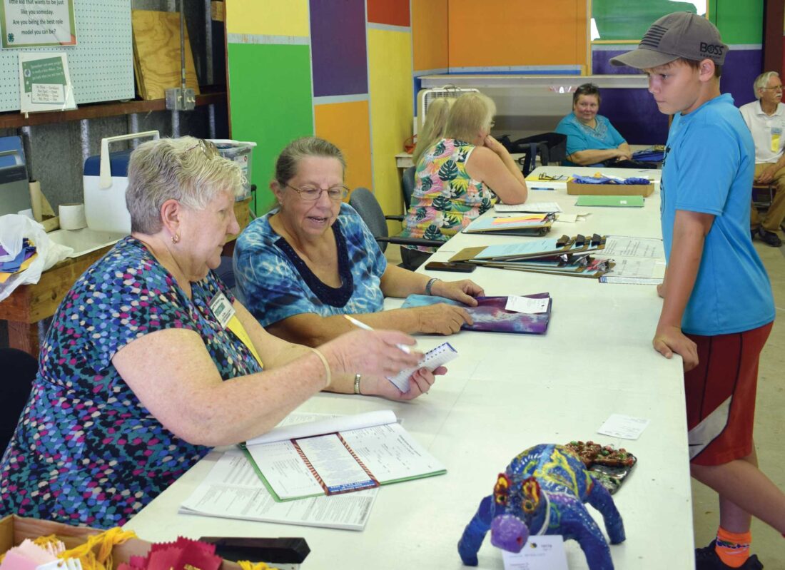 ELEVEN-YEAR-OLD Jeffrey Gordon of Niagara, Wis., enters his paper mache, ceramics and tie-dye items in the Marinette County Fair in Wausaukee to, from left, Carol Denowski, assistant superintendent, and Helen Schlinkerst, a judge. He also entered vegetables, and is showing rabbits and sheep. He is a member of the Badger Buds 4-H group in Niagara. (Marguerite Lanthier/Daily News photo)