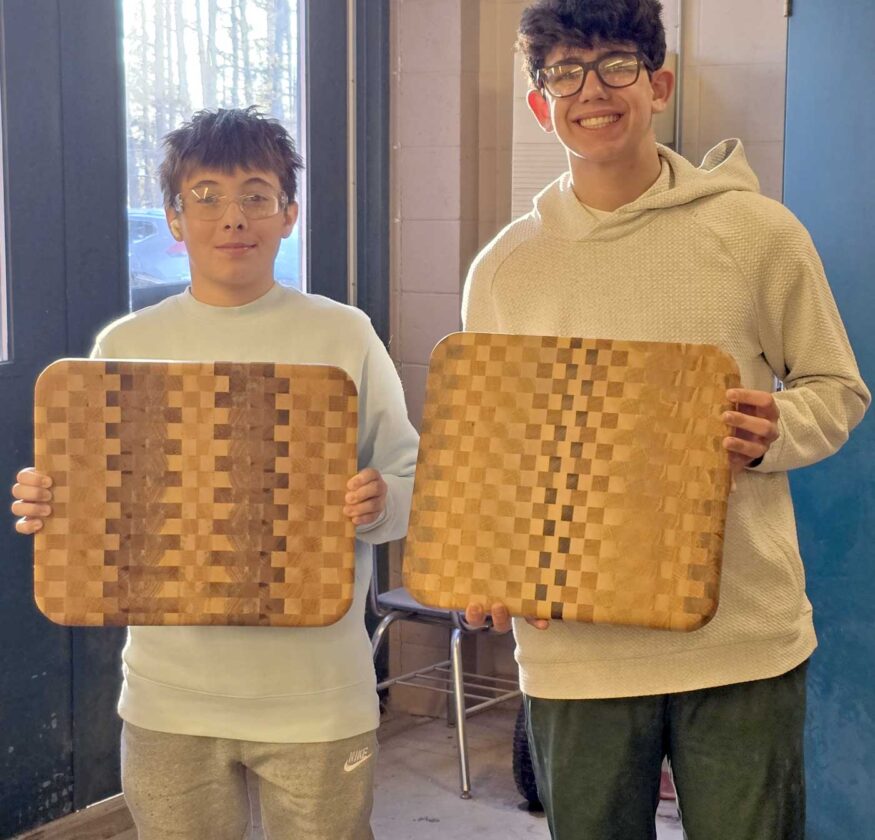 Freshman students from the Kingsford High School woodshop class, Tanner McElhinny and Chase Jungles, display their impressive end-grain cutting boards crafted during class.