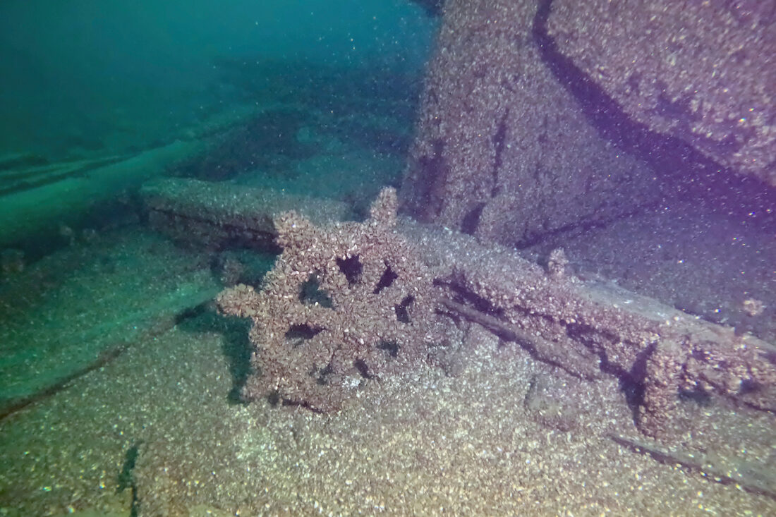 The wheel of the F.J. King shipwreck can be seen in Lake Michigan on Aug. 23, covered in invasive quagga mussels. According to the Wisconsin Historical Society and archaeology association's announcement, the ship ran into a gale off the Door Peninsula on Sept. 15, 1886, while moving iron ore from Escanaba to Chicago. (Wisconsin Historical Society via AP)