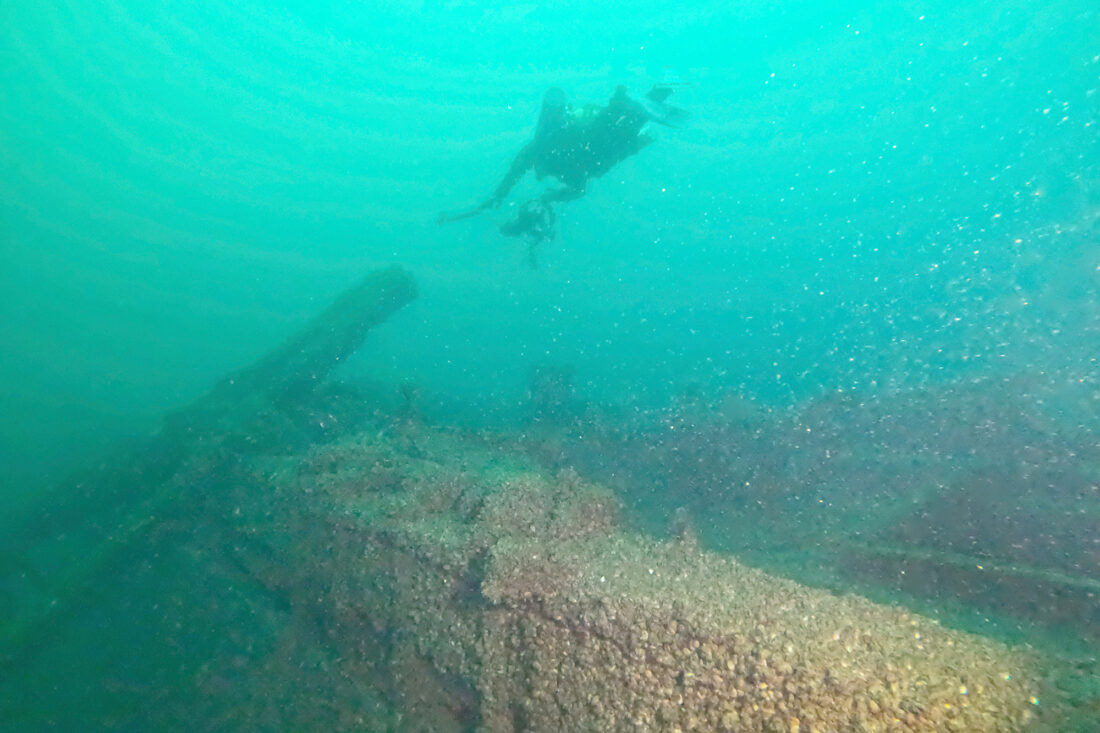 Wisconsin Historical Society diver Zach Whitrock collects images Aug. 23 of the wreckage of the schooner F.J. King for a photo model. (Wisconsin Historical Society via AP)