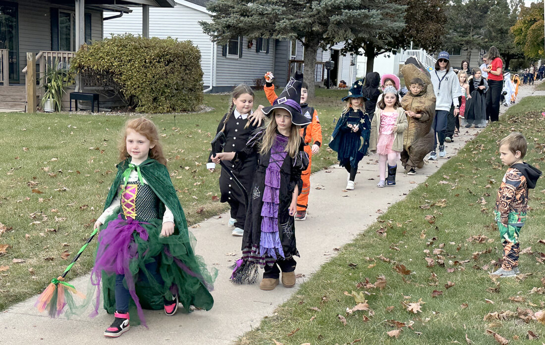Norway Elementary School hosted its annual Halloween parade Thursday in the community. Early kindergarten through sixth grade students took part in the parade to Main Street and back to the school. First graders, from front, are Sophie Bouche, Brynlee Quick, Addison Grunlund, Grayson Grailer, Aslyn Mendina, Bowynn Coppens and Crew Nora. The boy standing to the side could not be identified. (Terri Castelaz/Daily News)