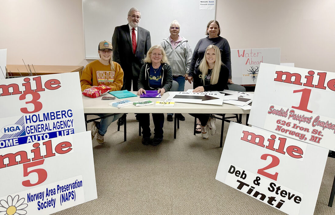 - The annual Leif’s Run takes place at 9 a.m. Saturday in downtown Norway. The race will kick off the day’s full slate of activities. Race coordinator Tori Normand prepares for Saturday’s races. Committee members were getting signage ready Wednesday for the run — from left, in back are Steve and Debbie Tinti and Monica McElroy-Denissen; in front are Kenzie Williamsen, Barb Thorne and Tori Normand. (Terri Castelaz/Daily News photo)