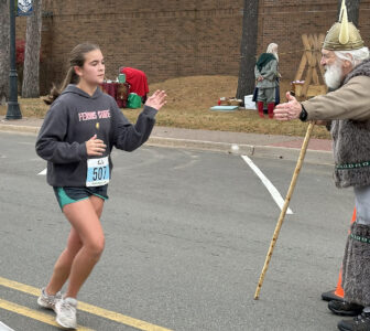 - Emma Bubloni of Norway crosses the finish line in the 2024 Leif’s Run as she gets a high-five from Dennis Lynch. (Contributed photo)