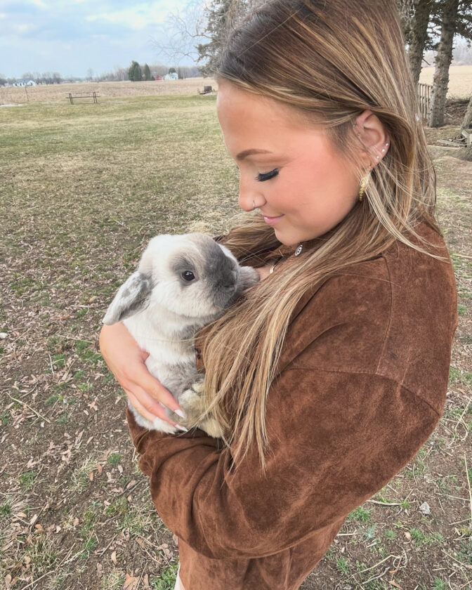 Former Iron Mountain resident Lara Hakamaki with one of her bunnies on her homestead in Ithaca, lower Michigan. She estimates she now has about 40 animals. (Courtesy photo)