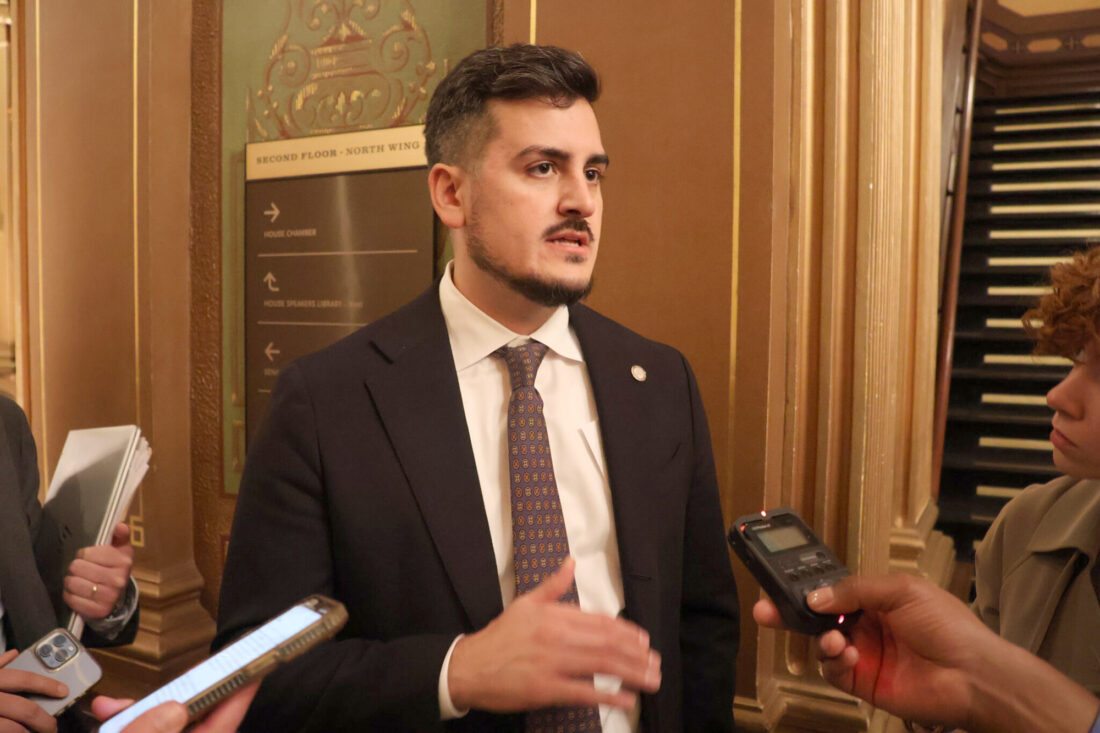 Senate PreK-12 Appropriations Subcommittee Chair Darrin Camilleri, D-Trenton, discusses the education budget with reporters Oct. 2. (Kyle Davidson/Michigan Advance)
