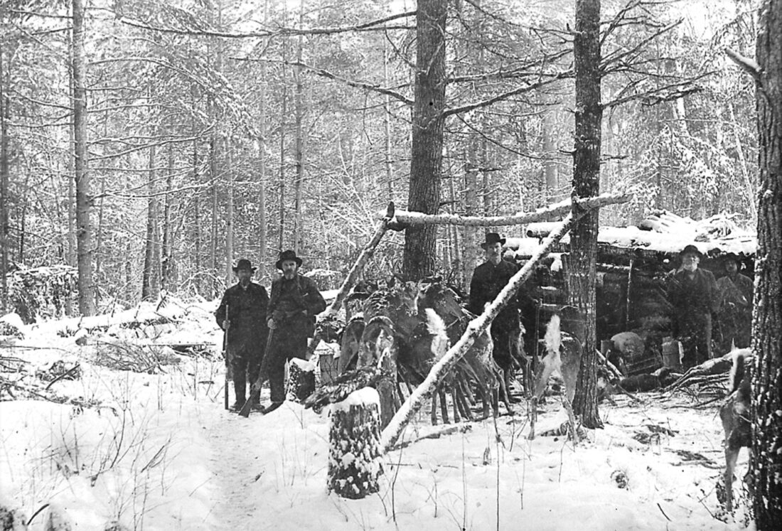 Hunters pose near a primitive shelter at a deer camp in Florence County, Wis., after what looks to have been a successful hunt in the 1890s. (Photo provided by the Menominee Range Historical Museum)