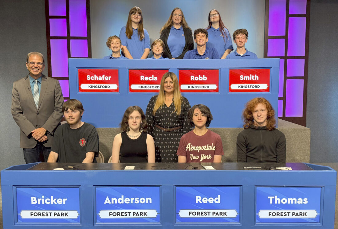 Kingsford played Forest Park in "High School Bowl" and lost by a score of 130-150. Representing Kingsford, seated from left are players Owen Schafer, Lou Recla, team captain Clark Robb, and Conor Smith. Standing are alternates Anja Bradley and Kaylee Caldwell with coach Colleen Driscoll. Players for Forest Park are, seated from left, John Thomas, Lauren Reed, team captain Emma Anderson and Jacob Bricker. Standing is alternate Morris Holm with coach Barbara Waara. "High School Bowl" host Jim Koski is standing at lower left. Thirty-six schools from the Upper Peninsula and northern Wisconsin compete in WNMU-TV's "High School Bowl" tournament, now celebrating 47 years on the air. Forest Park will advance to the second round, when they play Munising, scheduled to air at 8 p.m. Eastern time Jan. 1. Running from November through the championship game in April, the "High School Bowl" series airs on WNMU-TV Saturdays at 8 p.m. and Mondays at 3 p.m. Eastern time. It is also available statewide on the Michigan Learning Channel. For more information on the 2025-2026 tournament, go online to wnmutv.nmu.edu.