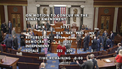 In this image provided by House Television, the vote total showing passage of the bill in the House to end the government shutdown is displayed Wednesday at the Capitol in Washington. (House Television via AP)