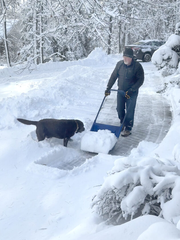 - Todd Caudell of Iron Mountain, joined by Cooper, clears a path Monday after the area’s first big snowfall of the season. (Eden Caudell photo)