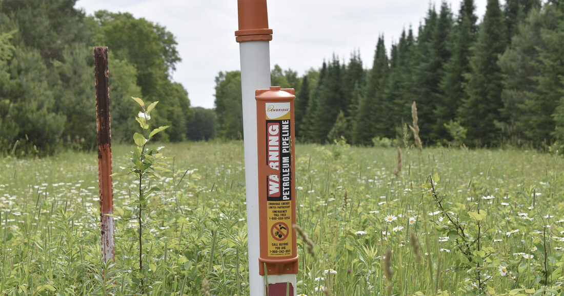 - A post marks where Enbridge’s Line 5 crosses the reservation of the Bad River Band of Lake Superior Chippewa in June 2022. The Canadian energy firm is proposing to reroute Line 5 for 41 miles around the tribe’s reservation in northern Wisconsin. (Danielle Kaeding/Wisconsin Public Radio)
