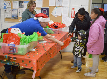 - At the 2024 Christmas event in Kingsford, Dennis Baldinelli passes a gift bag to 2-year-old Elijah Ritschel of Iron Mountain, as his mother Amy, and sister Leah look on. This year’s event will be Thursday evening. (Marguerite Lanthier/Daily News)
