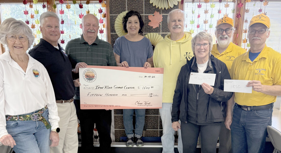 The Iron Area Health Foundation has awarded a grant in the amount of $1,500 to the Iron River Senior Citizen Center to help support the purchase of a new AED machine for the center. More than 4,000 people use the senior citizen center facility each year for various community activities and events. The Golden K also donated $300 towards the purchase of the new AED. From left, at the check presentation are Chris Kent, IAHF board president; Lyle Smithson Jr., IAHF director; Mike Aschinger, senior center volunteer; Tanya Stebbins, senior center site council president; and Dawn Pisoni, senior center council secretary/treasurer. Representing the Golden K and presenting the check to the center are Brian Kassa, Terry Spitza and Dave Koski. The IAHF and Goldent K are very pleased to support the purchase of this potentially lifesaving device for the Iron River Senior Citizen Center.