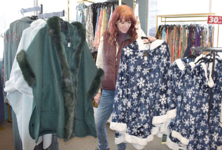 Ellie Reed, owner of Flyvibez, shows off one the new winter shawls they have in stock. (Marguerite Lanthier/Daily News)