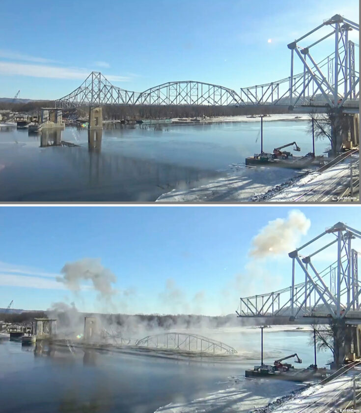 This combination of images provided by Iowa Department of Transportation shows, top, the 94-year-old Black Hawk Bridge over the Mississippi River between Iowa and Wisconsin and, bottom, after the bridge was imploded Friday. (Iowa Department of Transportation via Associated Press)