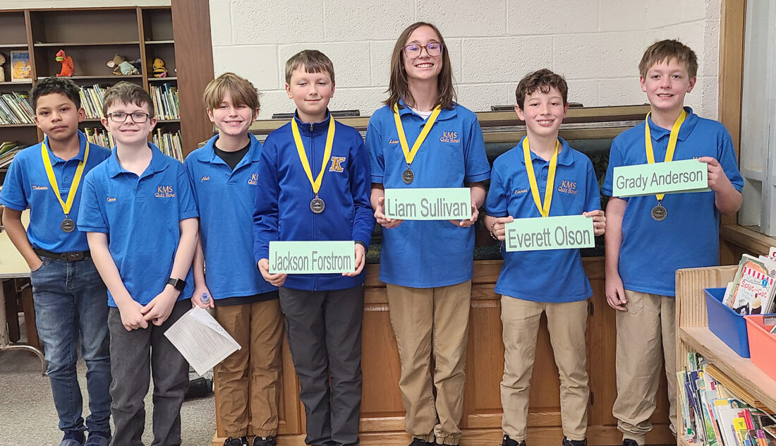 Kingsford Middle School Quiz Bowl team took fourth in the 42nd Upper Peninsula Junior High Quiz Tournament on Dec. 6 in Bark River. The team won their preliminary bracket, outscoring the four teams they played 870-310. After the final rounds, they placed 4th overall — out of 20 teams. Team members with their medals are Valentin Rodrigez, Owen Farrington (alternate), Abel Sullivan (alternate), Jackson Forstrom, Liam Sullivan (captain), Everett Olson, and Grady Anderson. The team is coached by Colleen Driscoll.