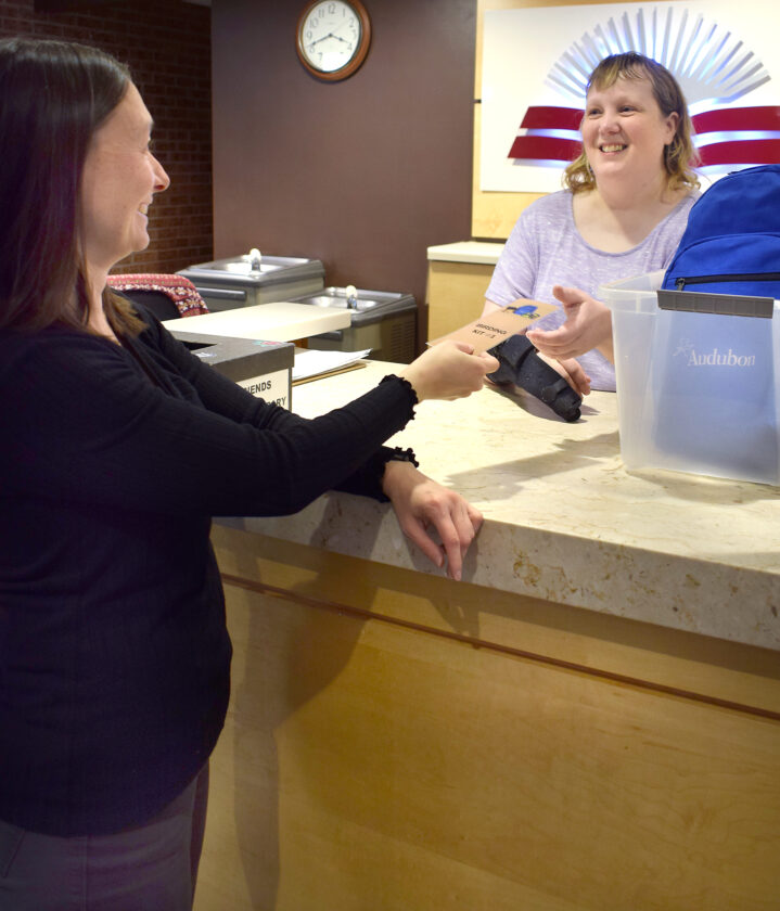 Me-Interlibrary Loan Specialist Nikki Younk checks out a birding kit from Dickinson County Library Local History and Adult Services Specialist Emily Cummings. (Terri Castelaz/Daily News)