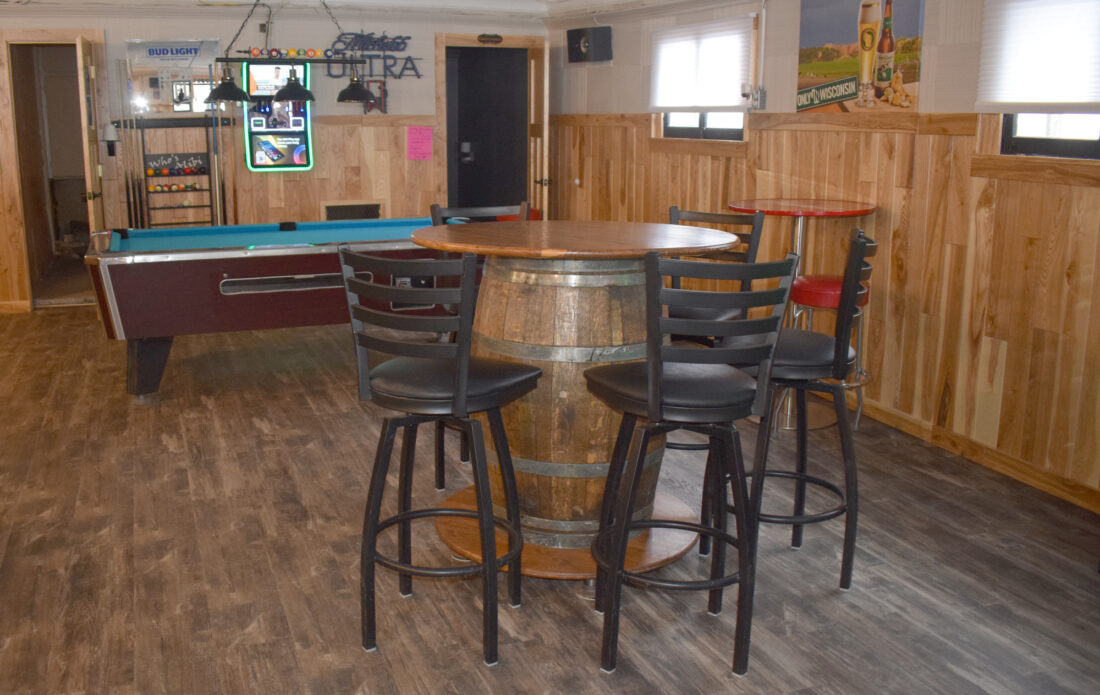 - A view inside Who’s Alibi shows one of the new whiskey barrel tables, with the pool table in the background. (Marguerite Lanthier/Daily News)