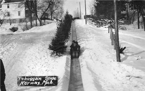 The postcard marked “Toboggan Slide, Norway, Mich.” captures three children coming down the toboggan track. The photograph is believed to date between 1925 and 1940.