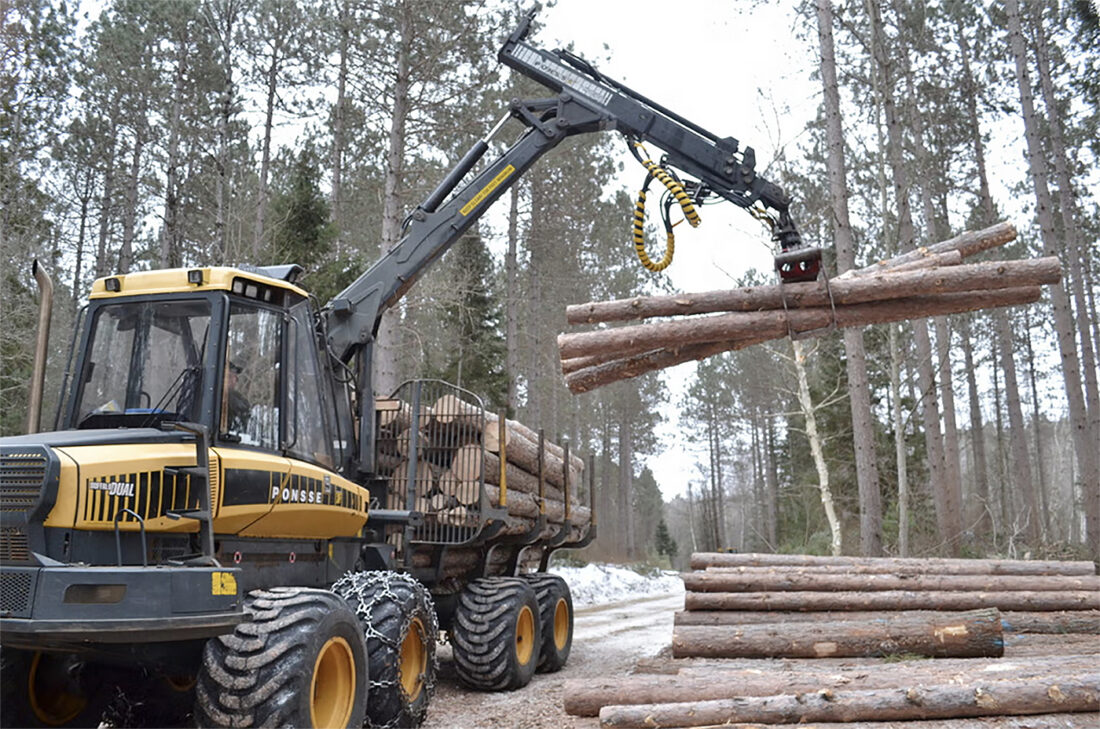 - A forwarder stacks freshly cut logs on the side of a timber road in the Chequamegon-Nicolet National Forest in northern Wisconsin. (Glen Moberg/Wisconsin Public Radio, file)