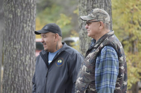 St. Croix Tribal Chairman Conrad St. John speaks with tribal elder Bruce Sonnenberg at the Clam Lake boat landing on Oct. 14. (Danielle Kaeding/Wisconsin Public Radio)