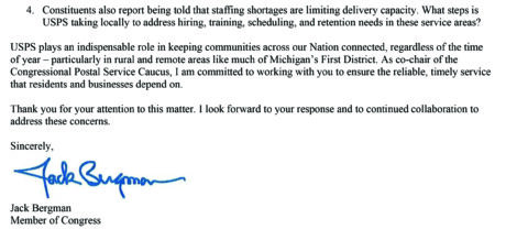 U.S. Rep. Jack Bergman, R-Watersmeet, said in letter Tuesday to USPS Postmaster General and CEO David Steiner that a growing number of constituents have contacted his office “who are experiencing significant delays and other disruptions in mail delivery across the area.”